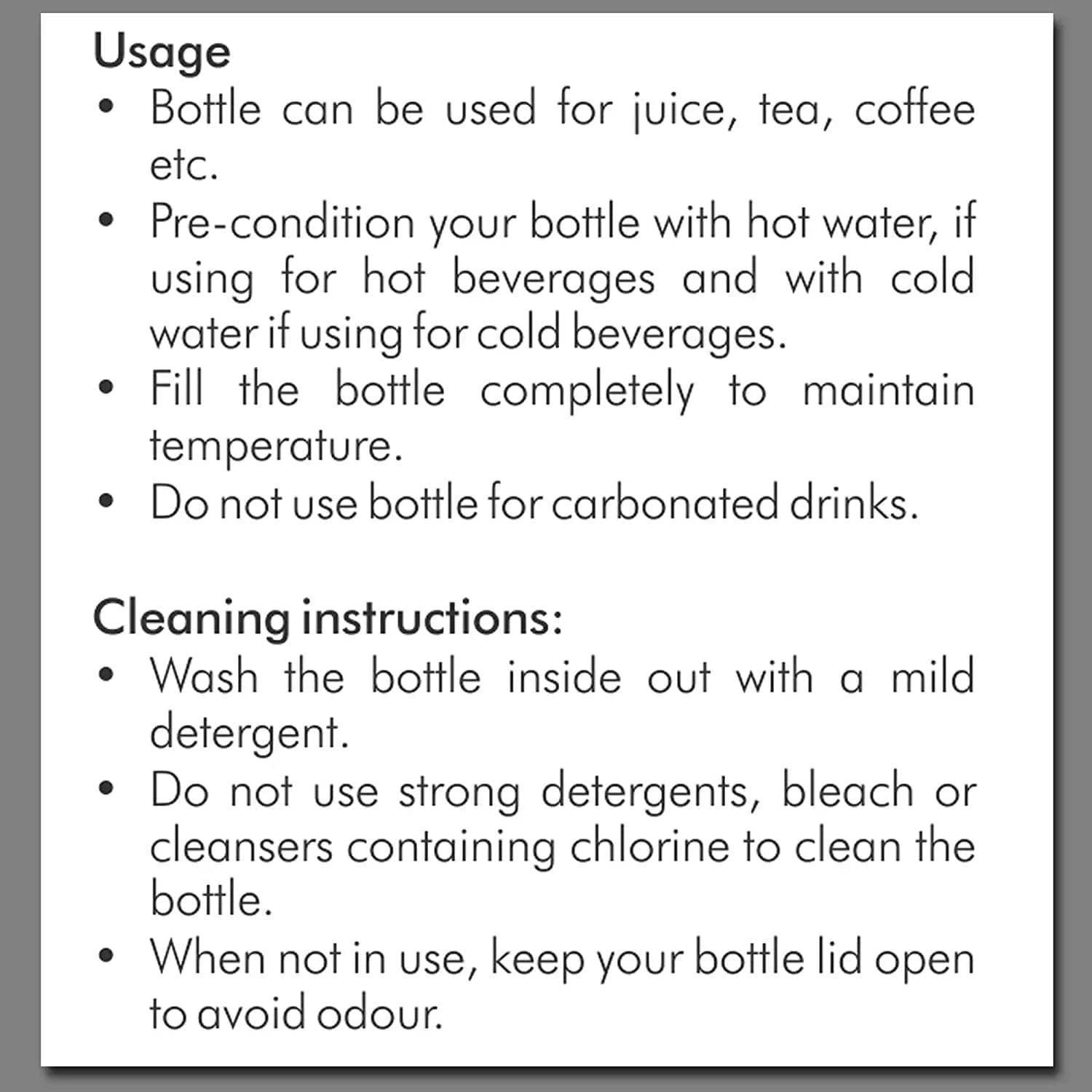 - USAGE: Pre-condition bottle with hot water if using for HOT beverage and cold water if using for COLD. Fill the bottle completely to maintain the temperature and do not use for carbonated drinks