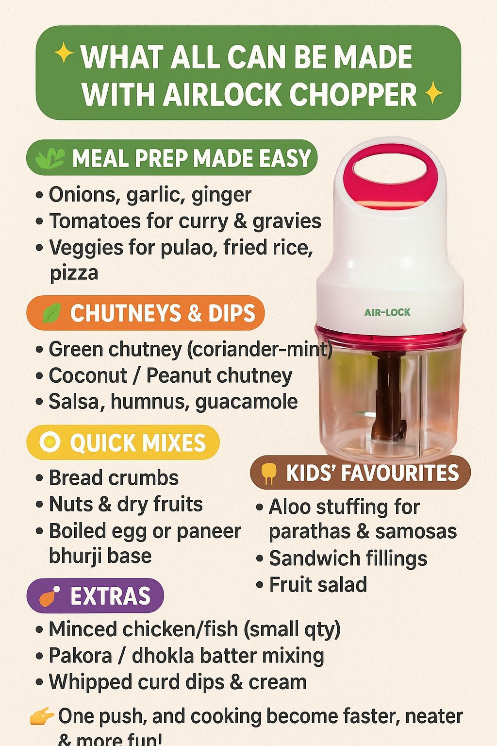 AirLock Electric Chopper | Multipurpose Food Processor with 3 Blades | Powerful, Compact & Easy to Use | Vegetable, Meat & Nut Grinder