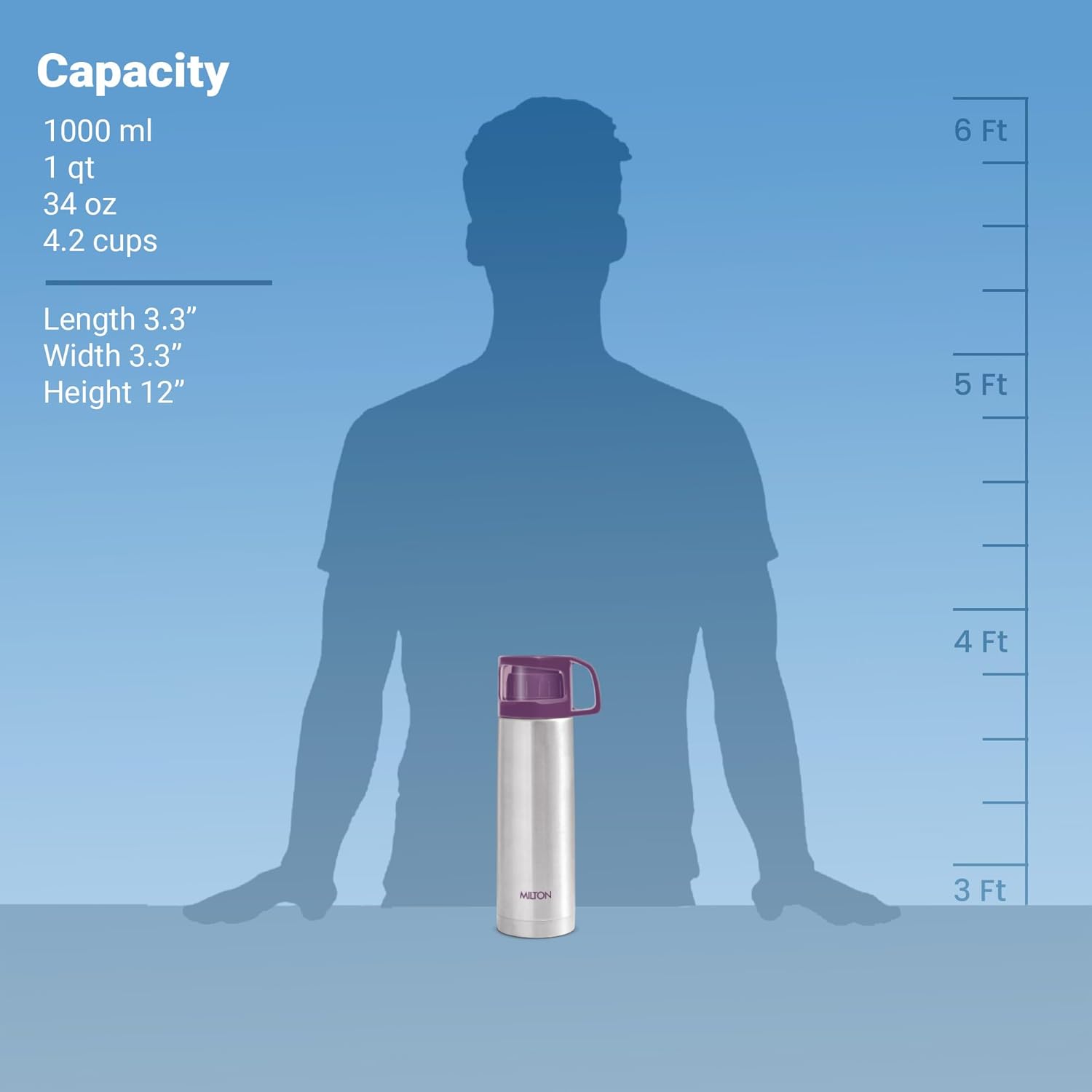Milton Glassy 1000 Thermosteel 24 Hours Hot and Cold Water Bottle with Drinking Cup Lid, 1 Litre, Purple